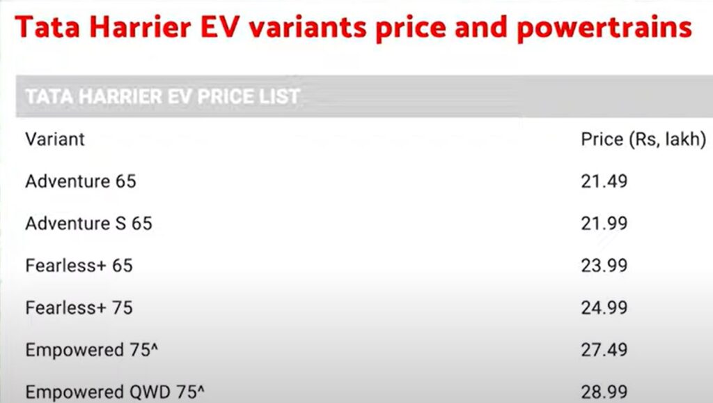 Tata Harrier EV को Acti.ev+ प्लेटफॉर्म पर तैयार किया गया है, Harrier EV मे 2 प्रकार के वैरिएंट्स देखने को मिलेगे पहला 65 kWh बैटरी जिसमे मिलेगा Adventure, Adventure S, Fearless+ ट्रिम्स जेसे मॉडल और दूसरा 75 kWh बैटरी इसमे आएगे यह मॉडल Fearless+, Empowered RWD, Empowered QWD ट्रिम्स, टाटा हैरियर ev मैं आपको 505 किलोमीटर तक की रेंज मिलती है,Tata Harrier EV को Acti.ev+ प्लेटफॉर्म पर तैयार किया गया है।